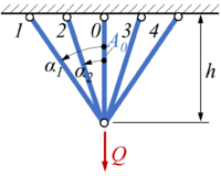 In dem aus 5 symmetrisch angeordneten Stäben bestehenden Fachwerk sollen die Stabquerschnitte bei gleichem Elastizititsmodul und gegebenen <math>A_0</math> und <math>Q</math> so gewählt werden, daß in allen Stäben die gleichen Zugkräfte auftreten. | In dem aus 5 symmetrisch angeordneten Stäben bestehenden Fachwerk sollen die Stabquerschnitte bei gleichem Elastizititsmodul und gegebenen <math>A_0</math> und <math>Q</math> so gewählt werden, daß in allen Stäben die gleichen Zugkräfte auftreten. | ||