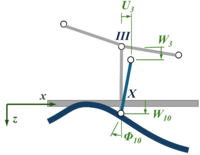 Koordinten des Modells sind damit die horizontalen und vertikalen Auslenkungen der Knoten I ... VII und die vertiakle Auslenkung und Kippung der Knoten in VIII ... XIV.