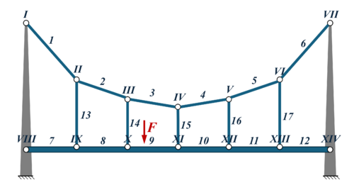 Gesucht ist ein einfaches, lineares FE-Modell für statische Spannungen und Verformungen der Seile und Fahrbahn. Die Verformung der Pylone soll icht berücksichtigt werden.