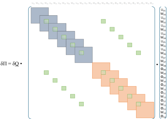 Dabei müssen die einzelnen Beiträge passend zu den Gesamtmatrizen hinzugefügt werden. Am Beispiel der Element-Steifigkeitsmatrix für das Hinzufügen von Element 14 ist das im folgenden dargestellt: