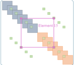Die grün umrandeten Felder zeigen auf, an welchen Stellen diese Elemente zur Gesamtsteifigkeitsmatrix hinzugefügt werden, das Magenta-farbene Rechteck zeigt die Beiträge für Element 14.