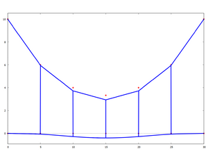 Die Spannweite der Brücke beträgt =30m, die Pylonhöhe AD beträgt =10m. Die Brücke wird durch ihr Gewicht und zusätzlichen Kräften zwischen D und E von =10kN an den Verbindungen mit den vertikalen Seilen belastet. Die Abmessungen von Seilen und Fahrbahn-Querschnitt wählen wir passend.
